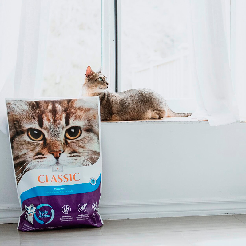 Extrem Classic es una arena ultra aglomerante (320%) sin olor. Su fórmula 99,9% libre de polvo neutraliza olores de forma natural, creando bolas compactas para una limpieza rápida y sin rastro de suciedad.