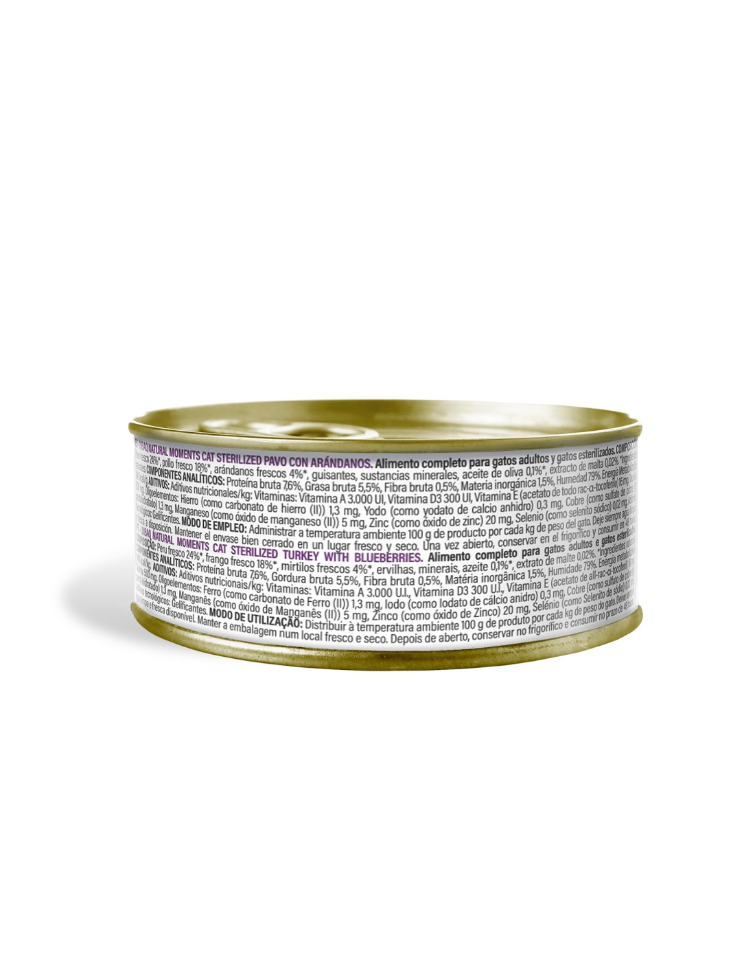 Alimento húmedo para gatos esterilizados con pavo y arándanos, natural, sin cereales, rico en proteínas, ayuda al control de peso y la salud urinaria.