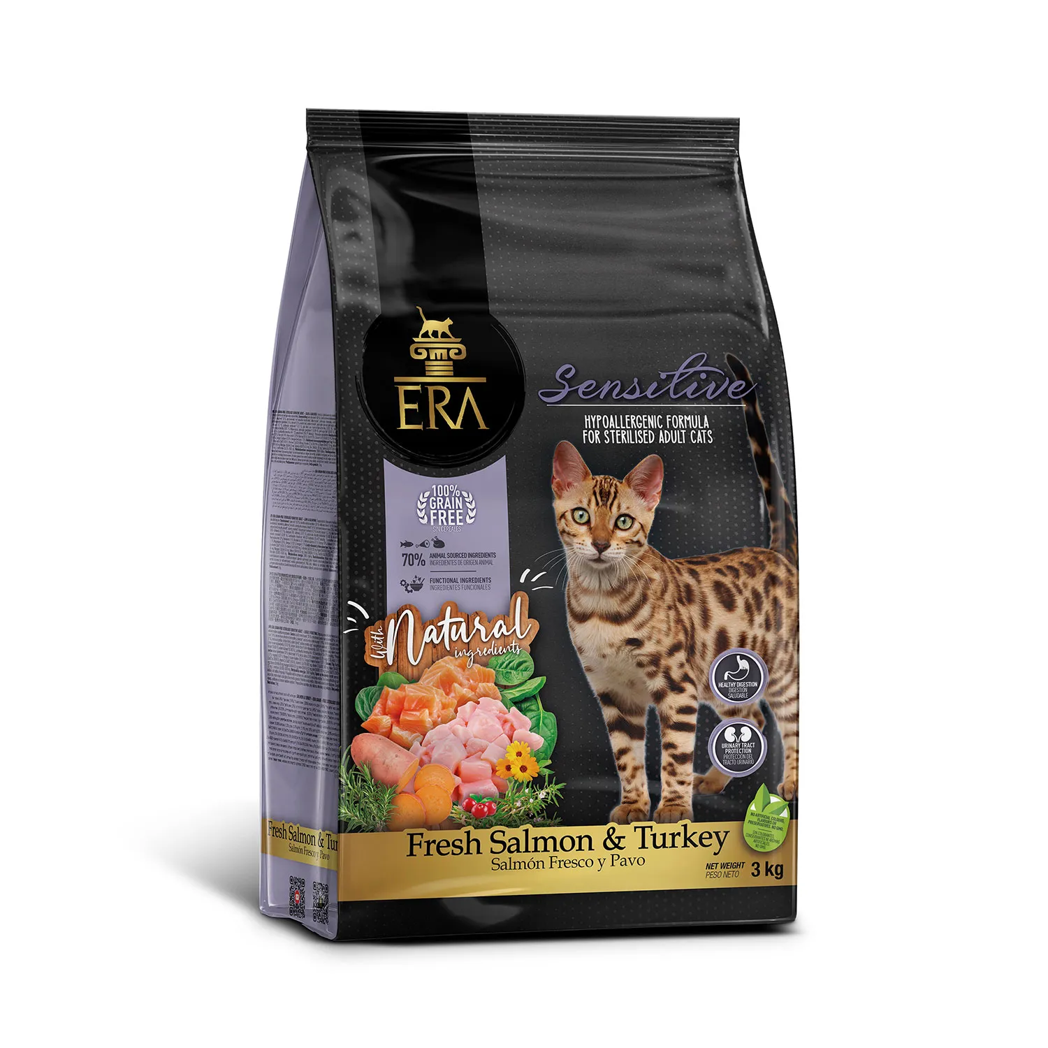 ERA Grain Free Salmón y Pavo es un alimento completo sin cereales para gatos esterilizados, elaborado con ingredientes seleccionados y adaptado a sus necesidades nutricionales.