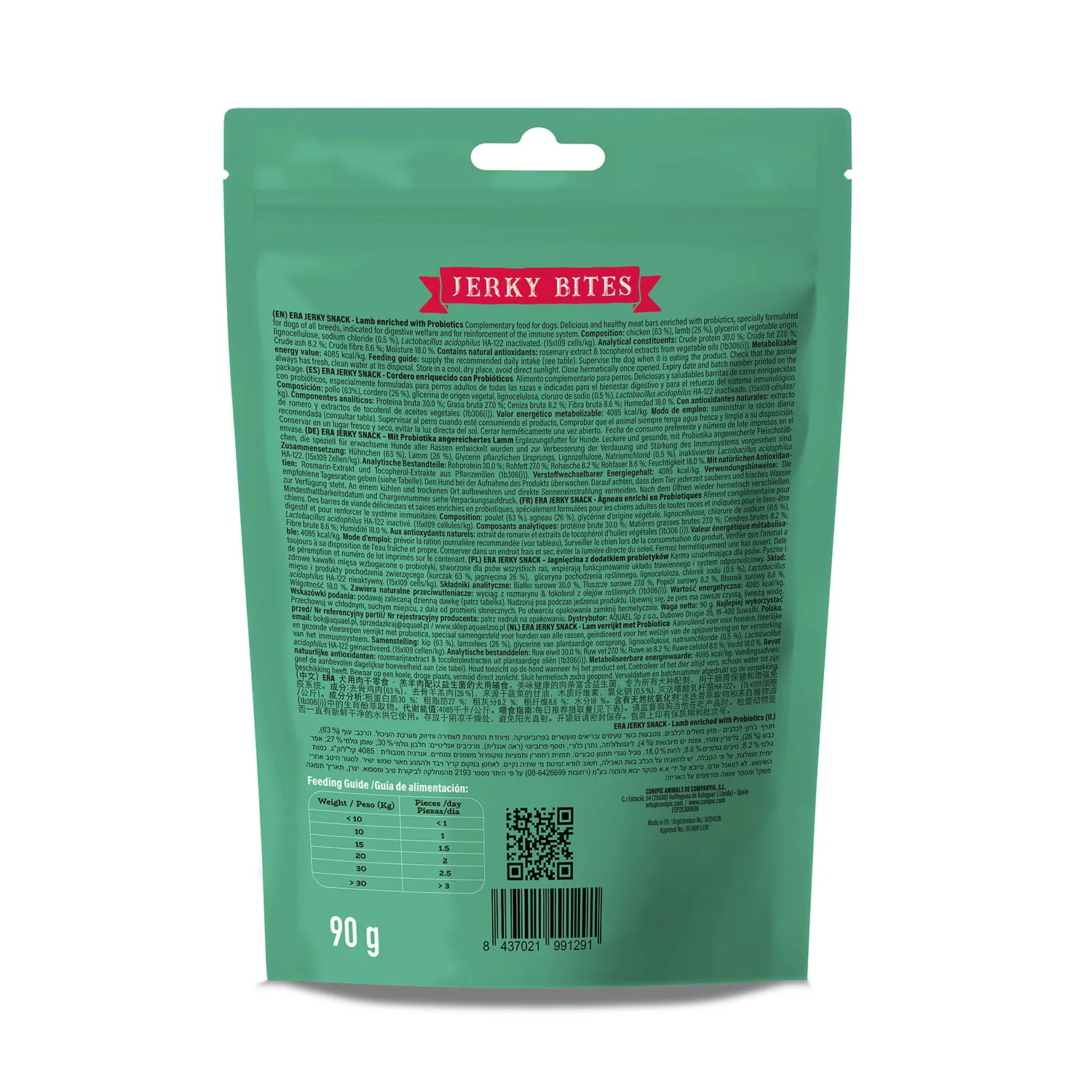 Dale a tu perro adulto un premio sabroso y saludable con los Snack ERA Jerky Bites de Cordero con Probióticos. Elaborados con carne de cordero deshidratada, estos snacks ofrecen un sabor irresistible y una nutrición equilibrada. Están enriquecidos con probióticos y prebióticos para favorecer una digestión saludable, mejorar la flora intestinal y apoyar el sistema inmunológico de tu mascota. Sin cereales ni ingredientes que puedan causar intolerancias, son una excelente opción para perros con estómagos sensibles o alergias alimentarias. ¡Un snack funcional y delicioso que tu perro adorará!