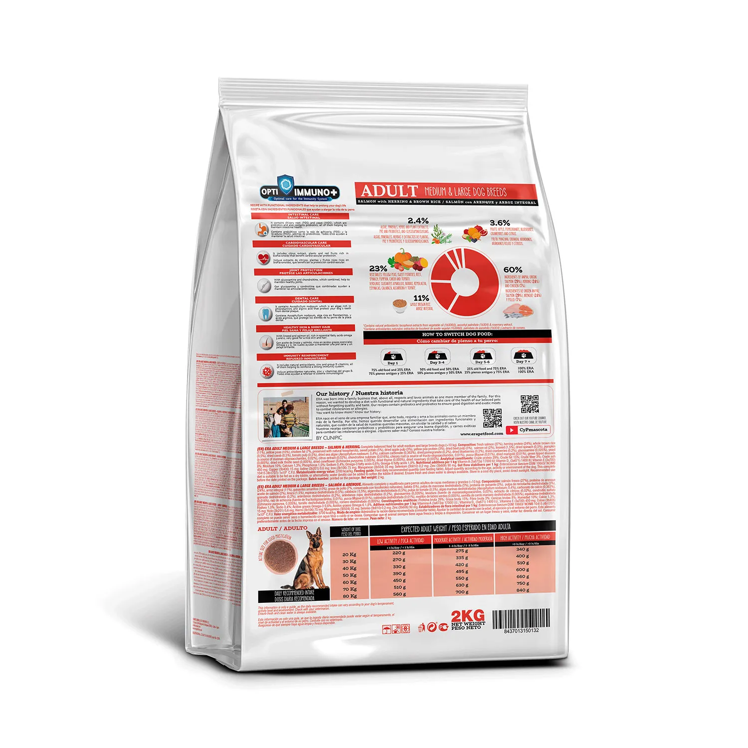 ERA Millennium Salmón y Arenque es un alimento completo y equilibrado diseñado para perros adultos de razas medianas y grandes. Su fórmula, rica en proteínas y reforzada con ingredientes funcionales, apoya un desarrollo saludable y un estado físico óptimo.