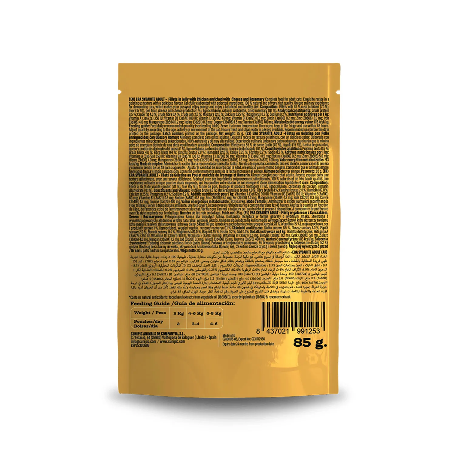 El alimento húmedo ERA Sybarite Pollo con Queso y Romero está especialmente formulado para gatos adultos de todas las razas. Con un 85% de carne fresca, ofrece una altísima palatabilidad y un gran valor nutricional. Su receta gourmet incluye solo ingredientes 100% naturales y de calidad premium, creando una experiencia culinaria única para los gatos más exigentes. Su fórmula sin cereales lo convierte en una opción ideal para gatos con sensibilidades alimentarias.