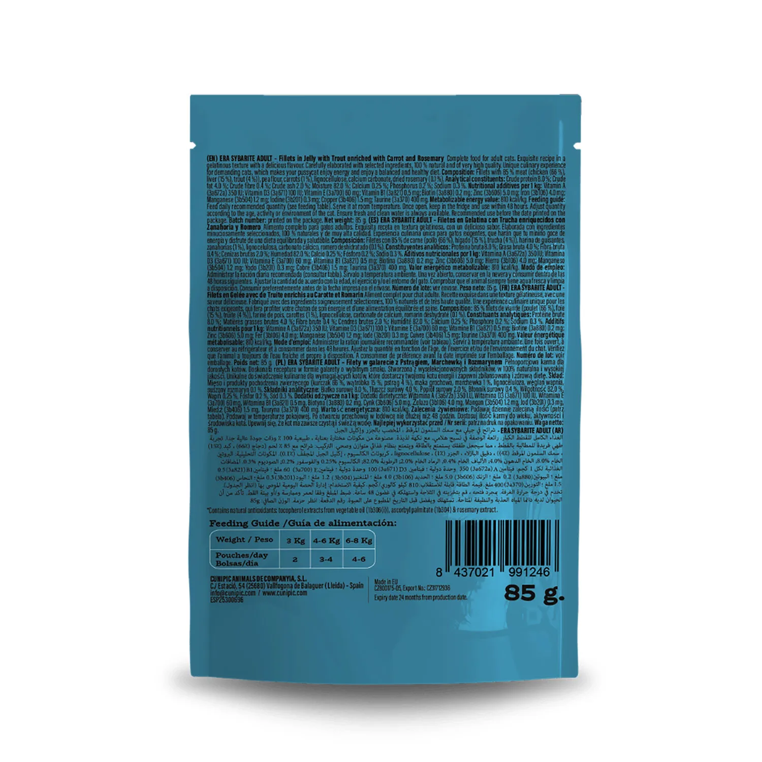 ERA Sybarite Trucha con Zanahoria y Romero es un alimento húmedo completo para gatos adultos de todas las razas. Elaborado con un 85% de carne fresca, garantiza un sabor irresistible y un alto valor nutricional. Su receta combina ingredientes 100% naturales y de calidad superior, ofreciendo una experiencia culinaria gourmet para gatos exigentes.