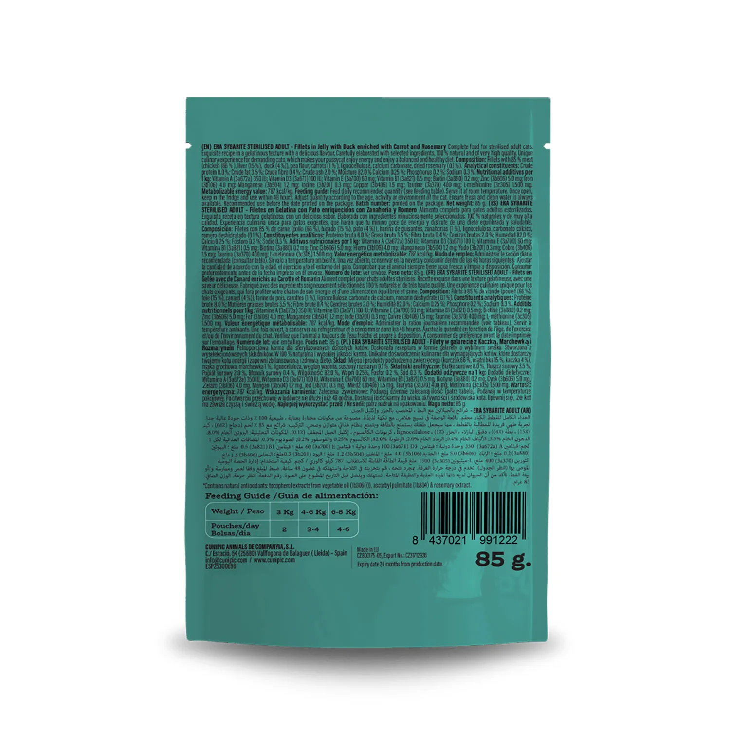 Filetes en gelatina con Pato enriquecidos con Zanahoria y Romero Composición: Filetes con 85 % de carne (pollo (66 %), hígado (15 %), pato (4 %)), harina de guisantes (2 %), zanahorias (1 %), lignocelulosa (0.7 %), carbonato cálcico (0.3 %), romero deshidratado (0.1 %).
