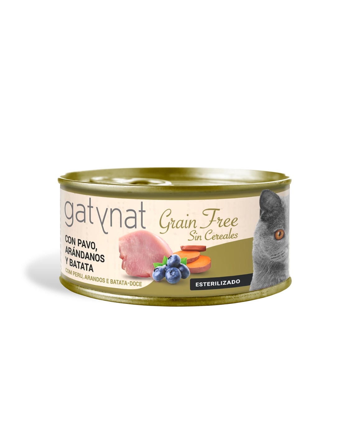 Gatynat Pavo con Arándanos y Batata es un alimento húmedo completo, hipoalergénico y sin cereales para gatos adultos, elaborado con pavo fresco y batata para una energía duradera
