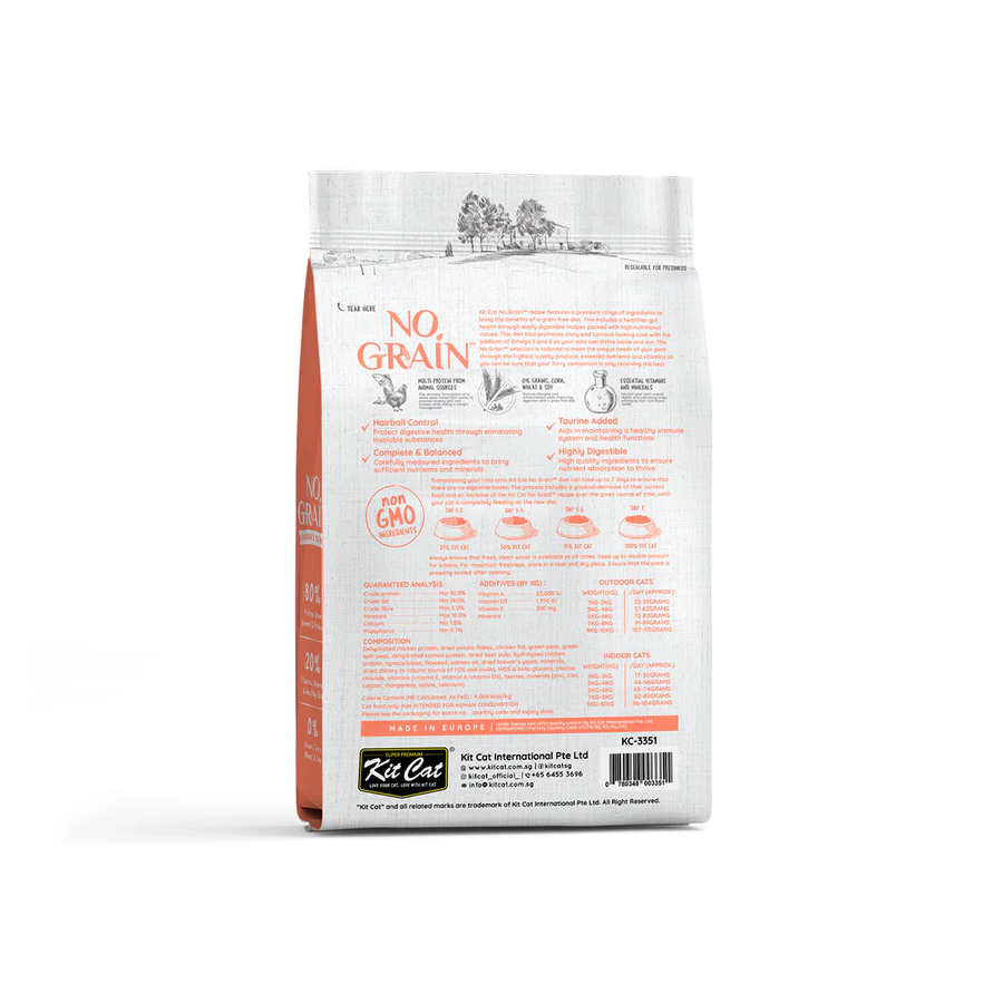 Transición La transición a nuestro pienso No Grain puede llevar hasta 7 días para garantizar que no haya problemas digestivos. El proceso incluye una disminución gradual de su alimento actual y un aumento del pienso Kit Cat durante el transcurso del tiempo dado, hasta que tu gato se esté alimentando completamente con la nueva dieta.