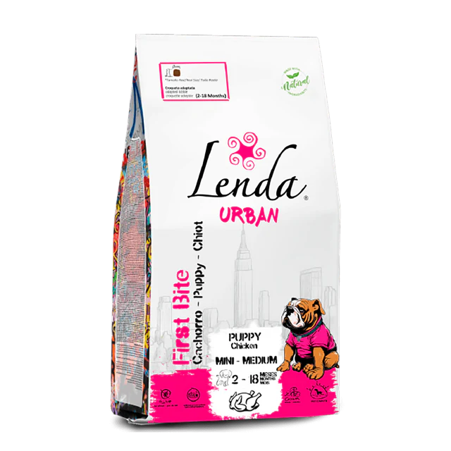 Lenda Urban First Bite es una receta natural para cachorros, con 40% de proteínas de pollo, cerdo y vacuno, sin conservantes ni colorantes, diseñada para un crecimiento sano y fuerte.